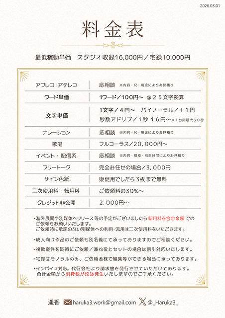 収録の前日 または 当日の 台本の追加や大幅な変更は追加料金 をいただく場合がございます。